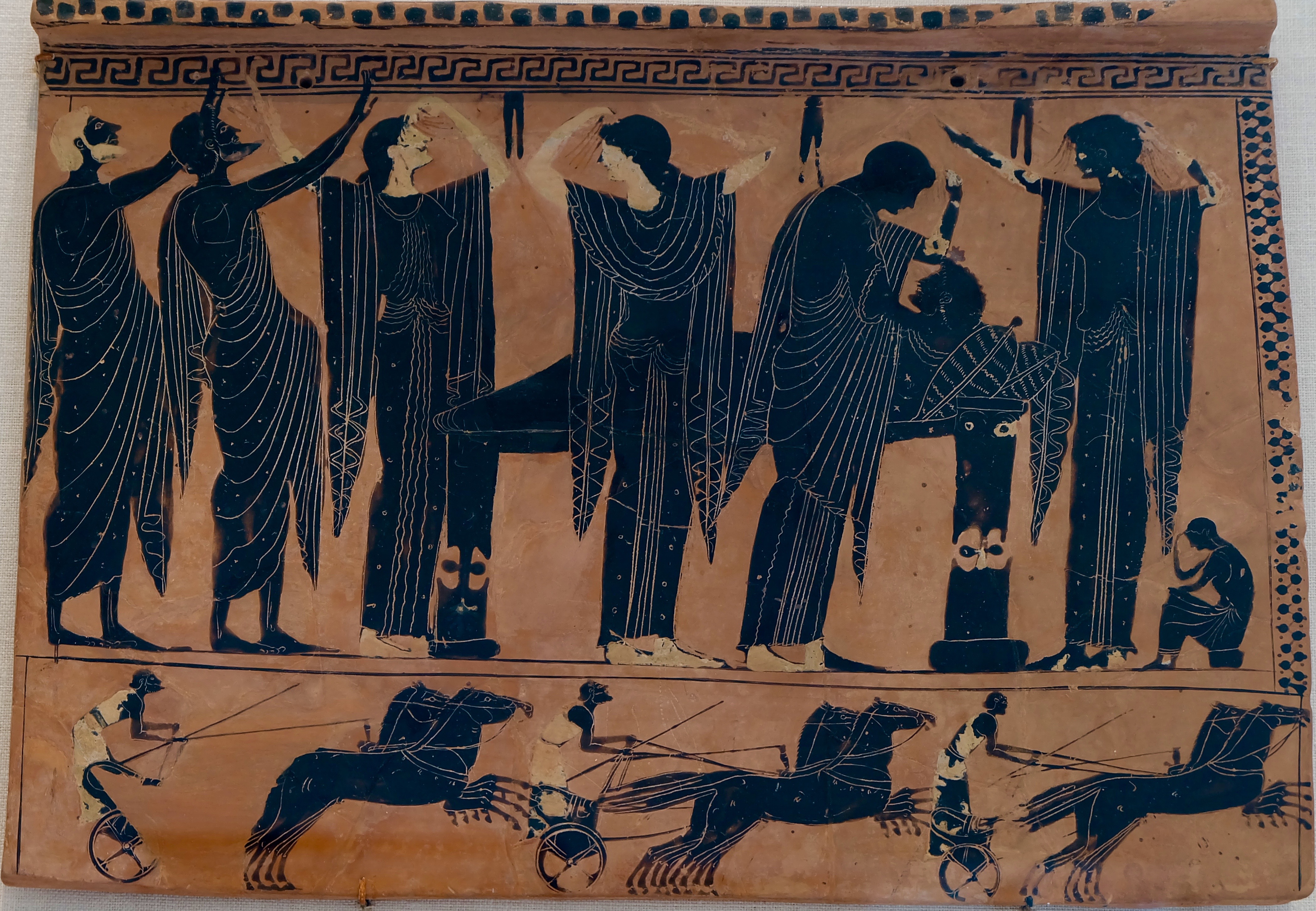 But Achilles would not let the Myrmidons go, [5] and spoke to his brave comrades saying, “Myrmidons, famed horsemen and my own trusted friends, not yet, I say, let us unyoke, but with horse and chariot draw near to the body and mourn Patroklos, in due honor to the dead. [10] When we have had full comfort of lamentation we will unyoke our horses and take supper all of us here.” Then they all joined in a cry of wailing and Achilles led them in their lament. Thrice did they drive their chariots all sorrowing round the body, and Thetis stirred within them a still deeper yearning.