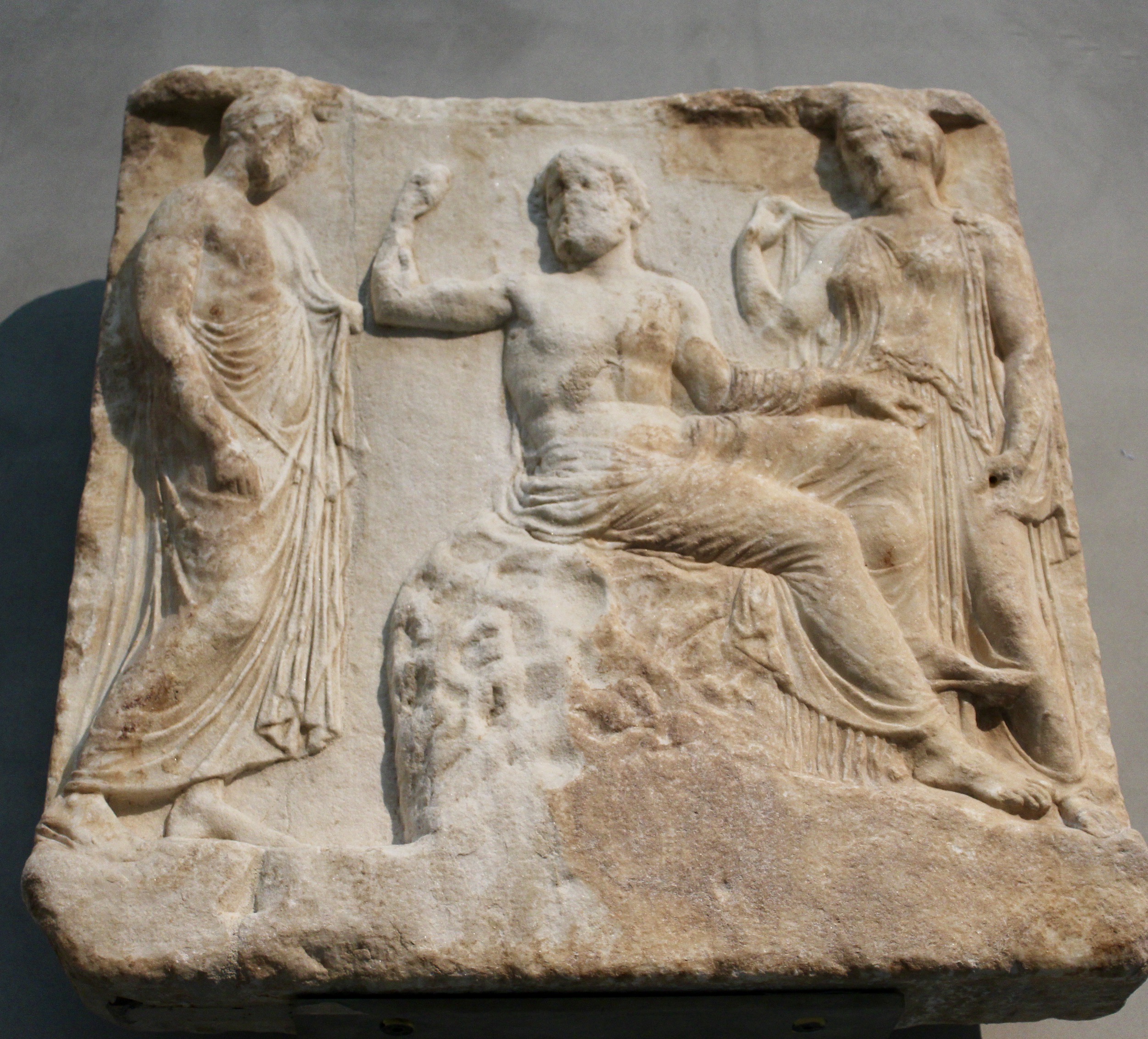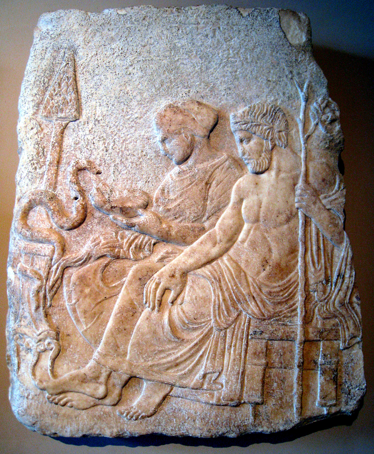 Marble relief of Asclepius and his daughter Hygieia. From Therme, Greece, end of the 5th century BC. Istanbul Archaeological Museums.
