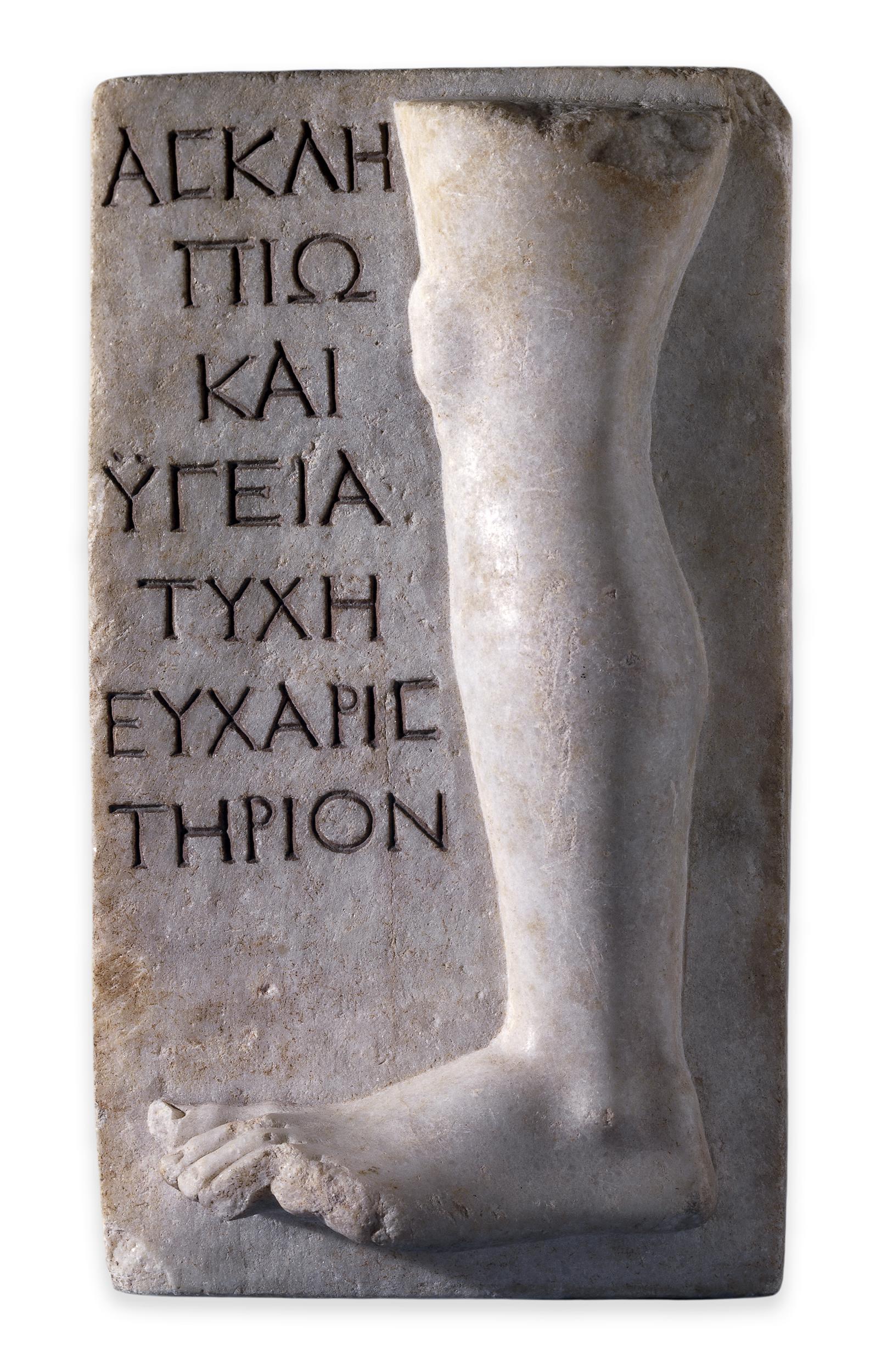 Marble relief representing part of a leg with an inscription dedicating it from Tyche to Asclepius and Hygieia as a thank offering, presumably for the cure of some affliction of the left leg. 100–200 CE. From Shrine of Asklepios. British Museum