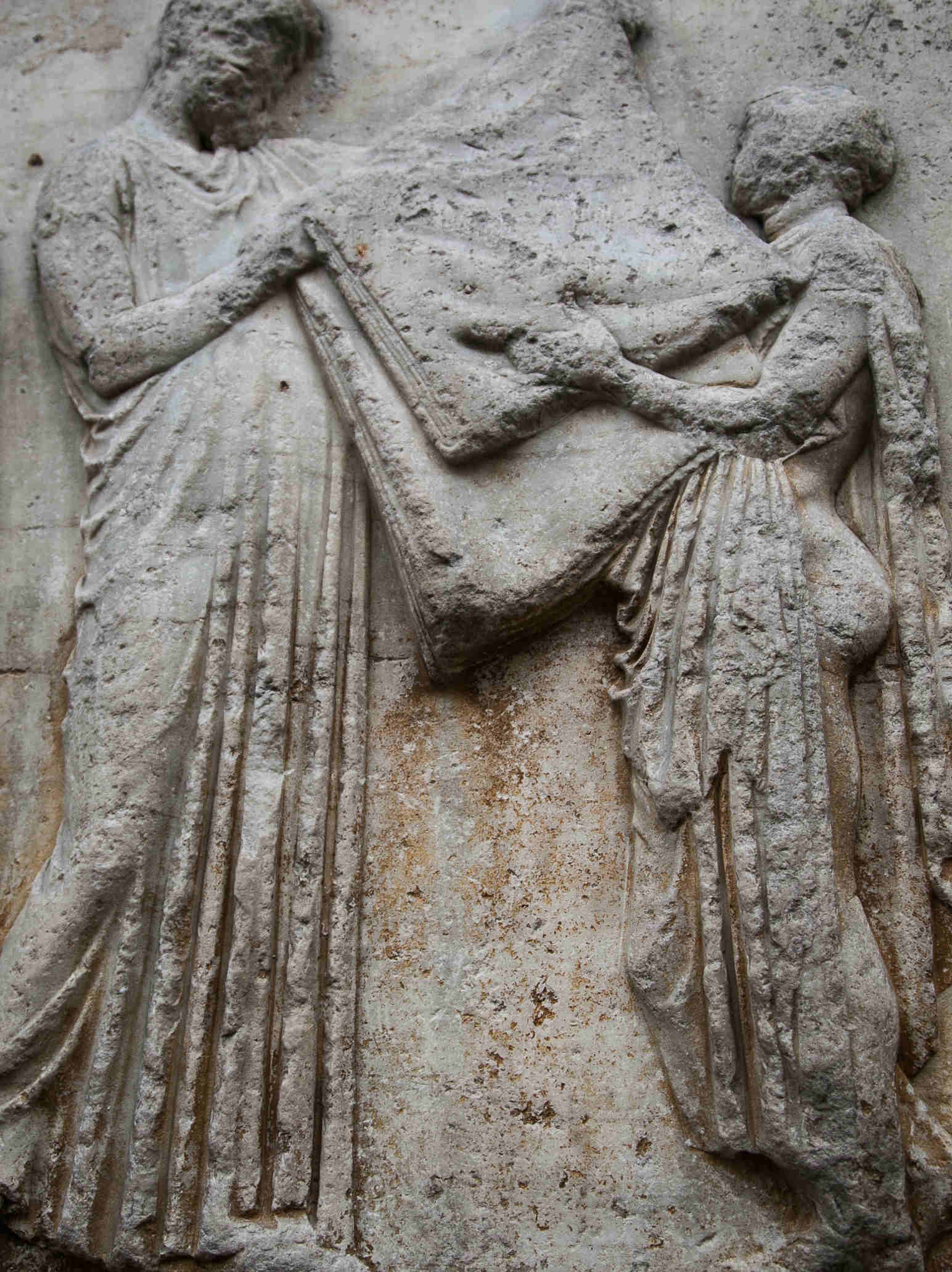 Along each side of the gallery: Centaurs in violent conflict with the Lapiths in the Centauromachy[5]; the calm procession which some say represents the contemporary Panathenaic Festival[6], others the founding myth of Athens, and others still the heroization of the 192 Athenians killed in the battle of Marathon (490 BCE in which the Athenians defeated the Persians against great odds); a boy (or girl?[7]) assisting an adult in folding a piece of cloth, understood to be the presentation of Athena’s peplos.