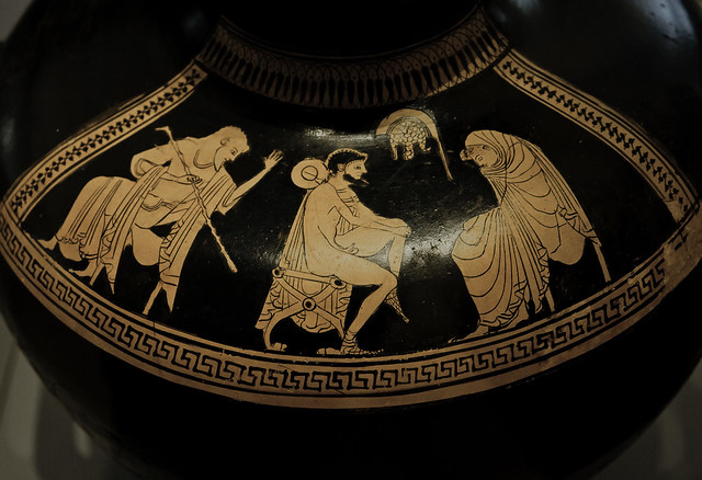 Achilles sitting wrapped in a himation. kylix, c 500 BCE.