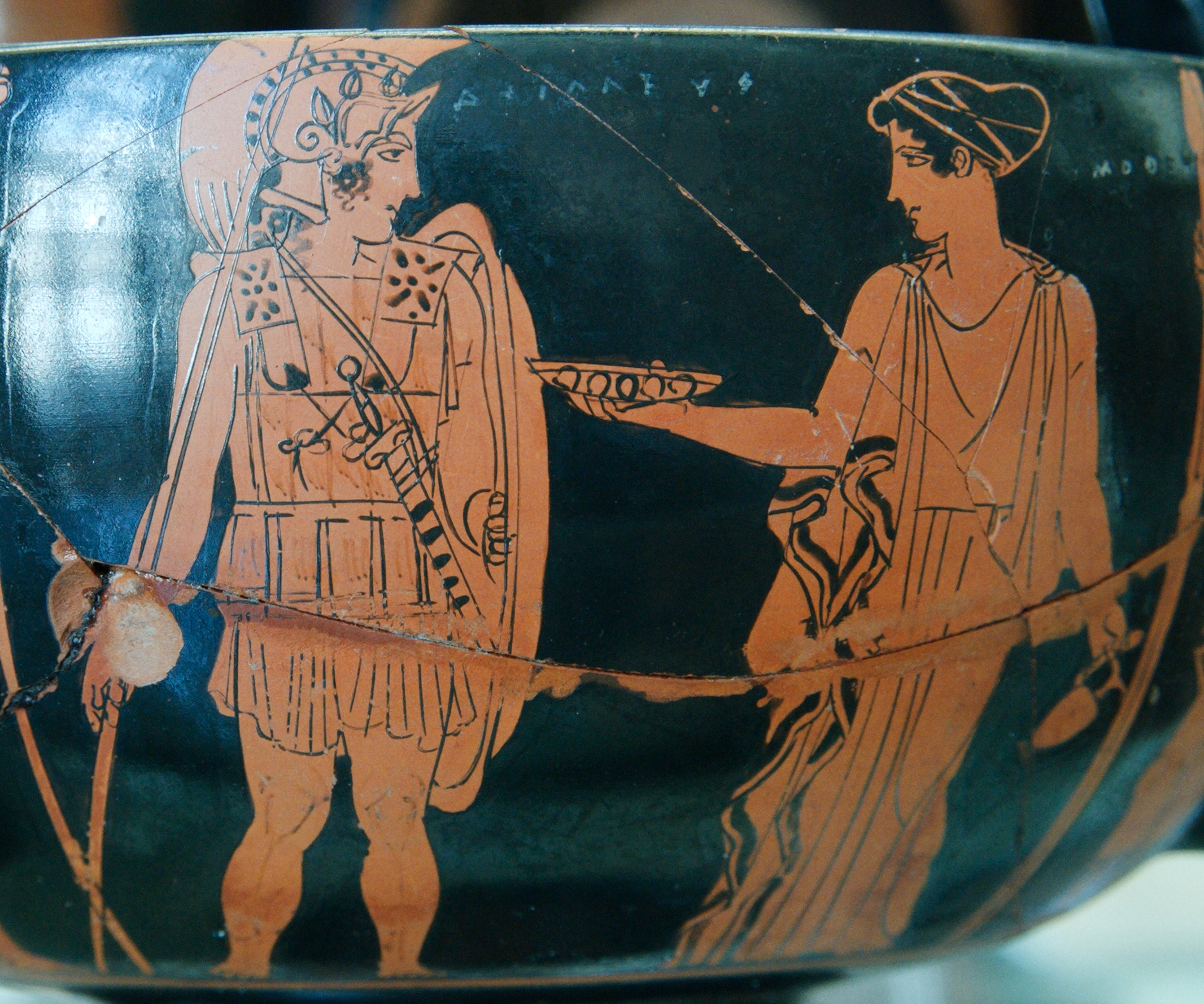 Attributed to Briseis Painter: Briseis being led away from Achilles. Side A, Red-figured kylix, c 480 BCE. British Museum.