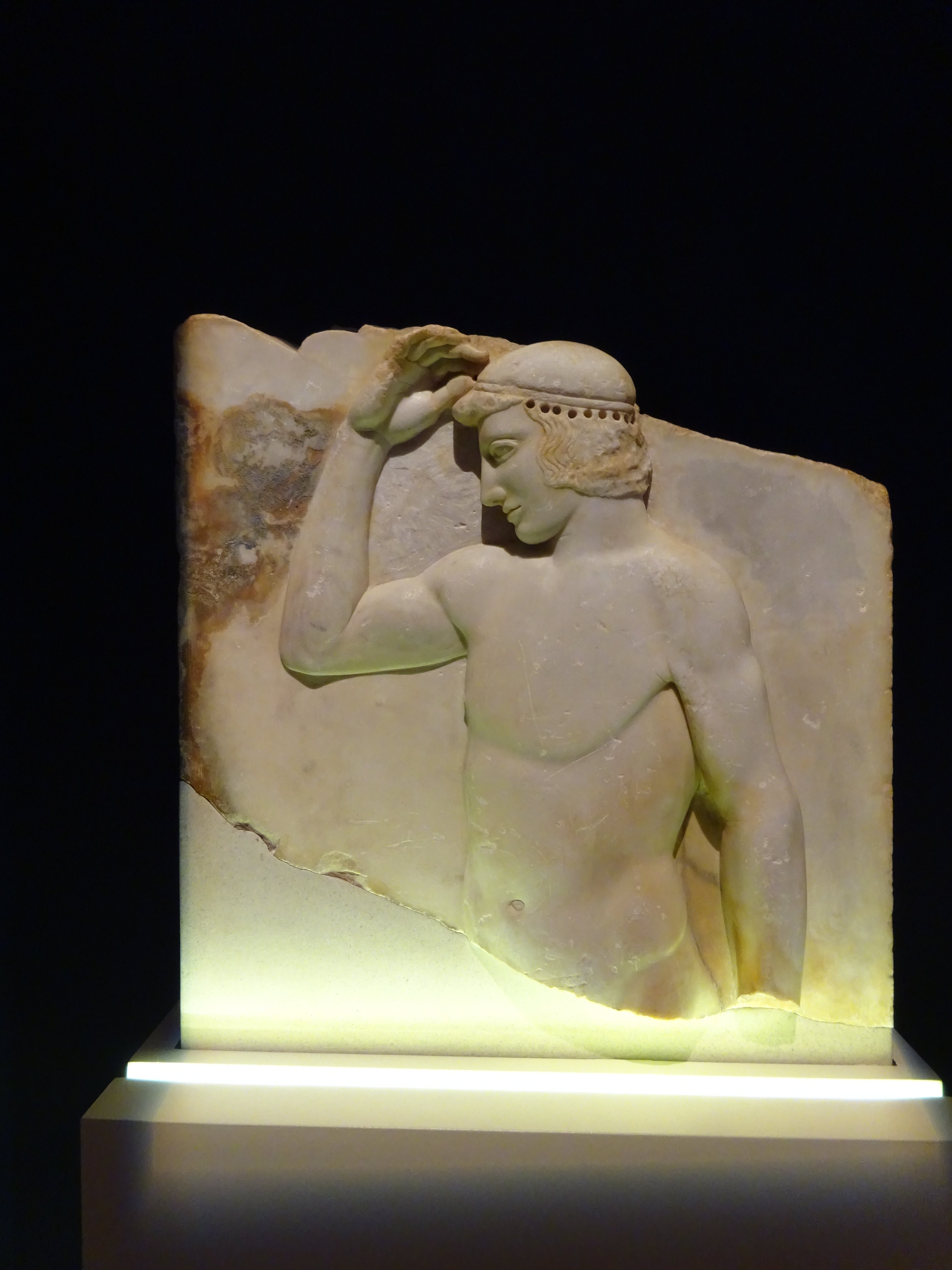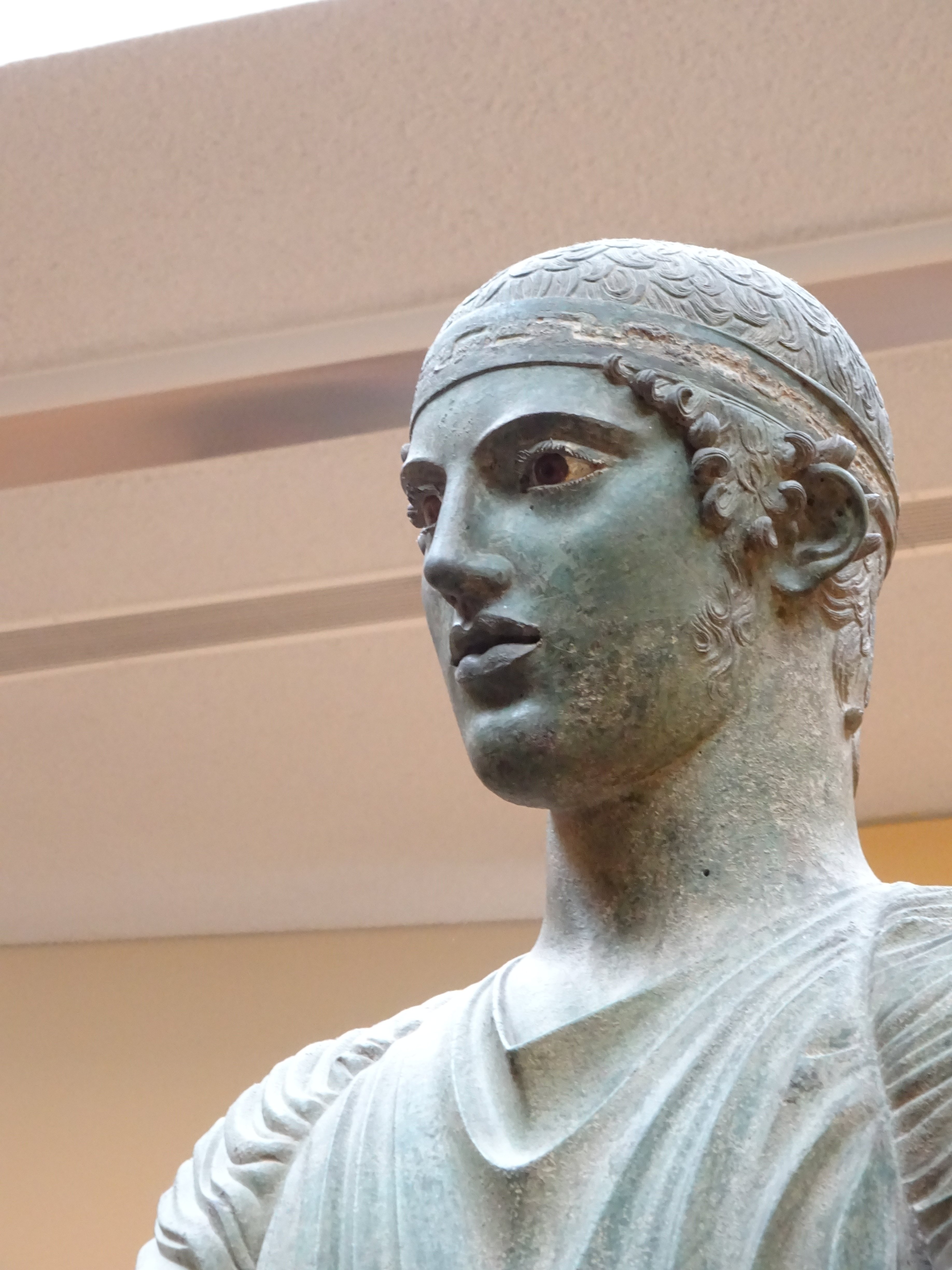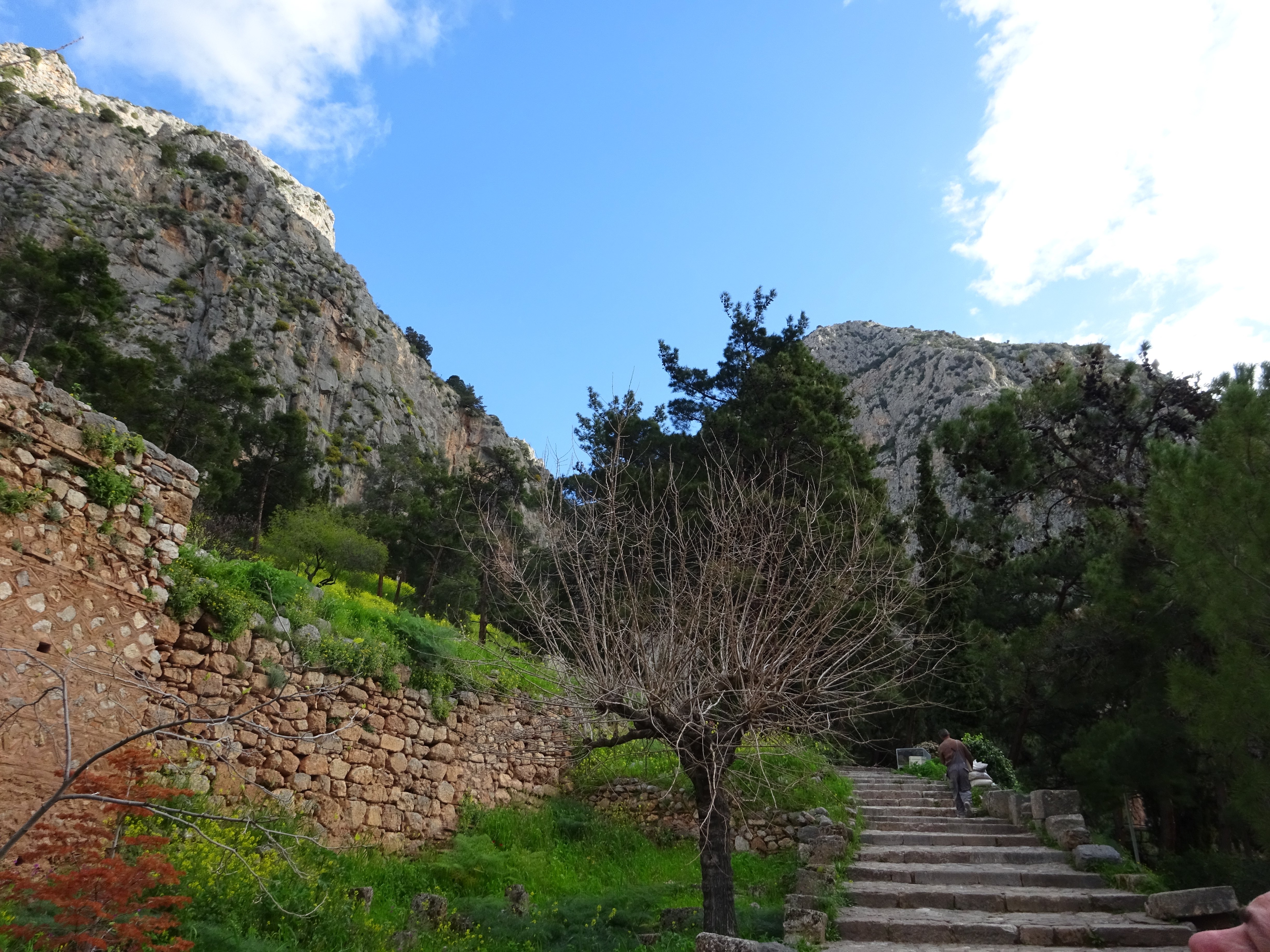 The site at Olympia is vast, with ruins set among banks of spring flowers. It must have been so busy during the festivals and sporting events. The running track proved irresistible to those members of the group with energy and stamina! Delphi was absolutely stunning, and the views gradually emerged the higher we climbed. Here was the cleft in the rocks where Apollo slew the Python, and the omphalos. There would have been sporting events here, too: the Pythian Games, and on the heights is a later, Roman-built stadium. There were many great artifacts in the Museum at Delphi: here are just a couple.