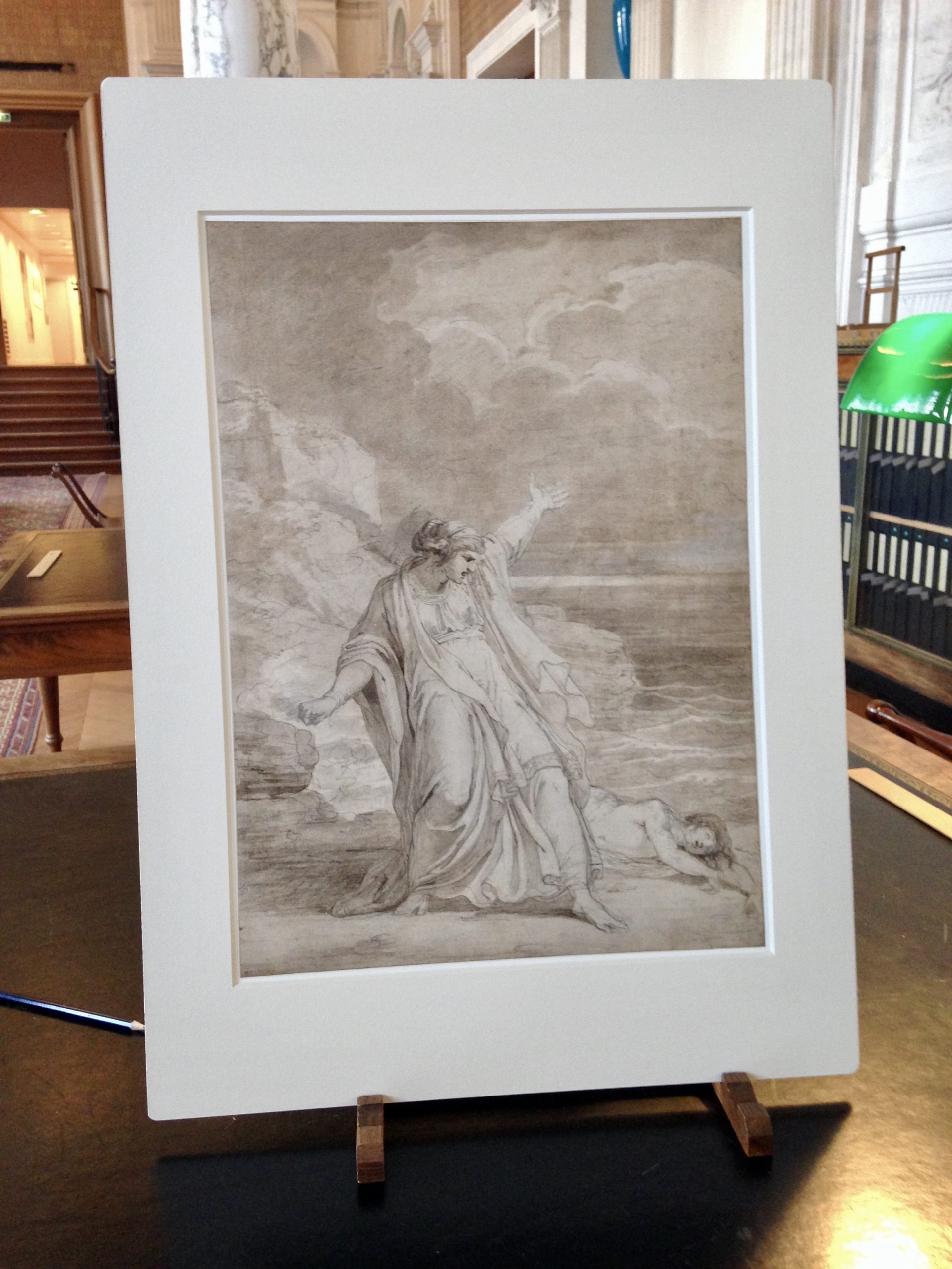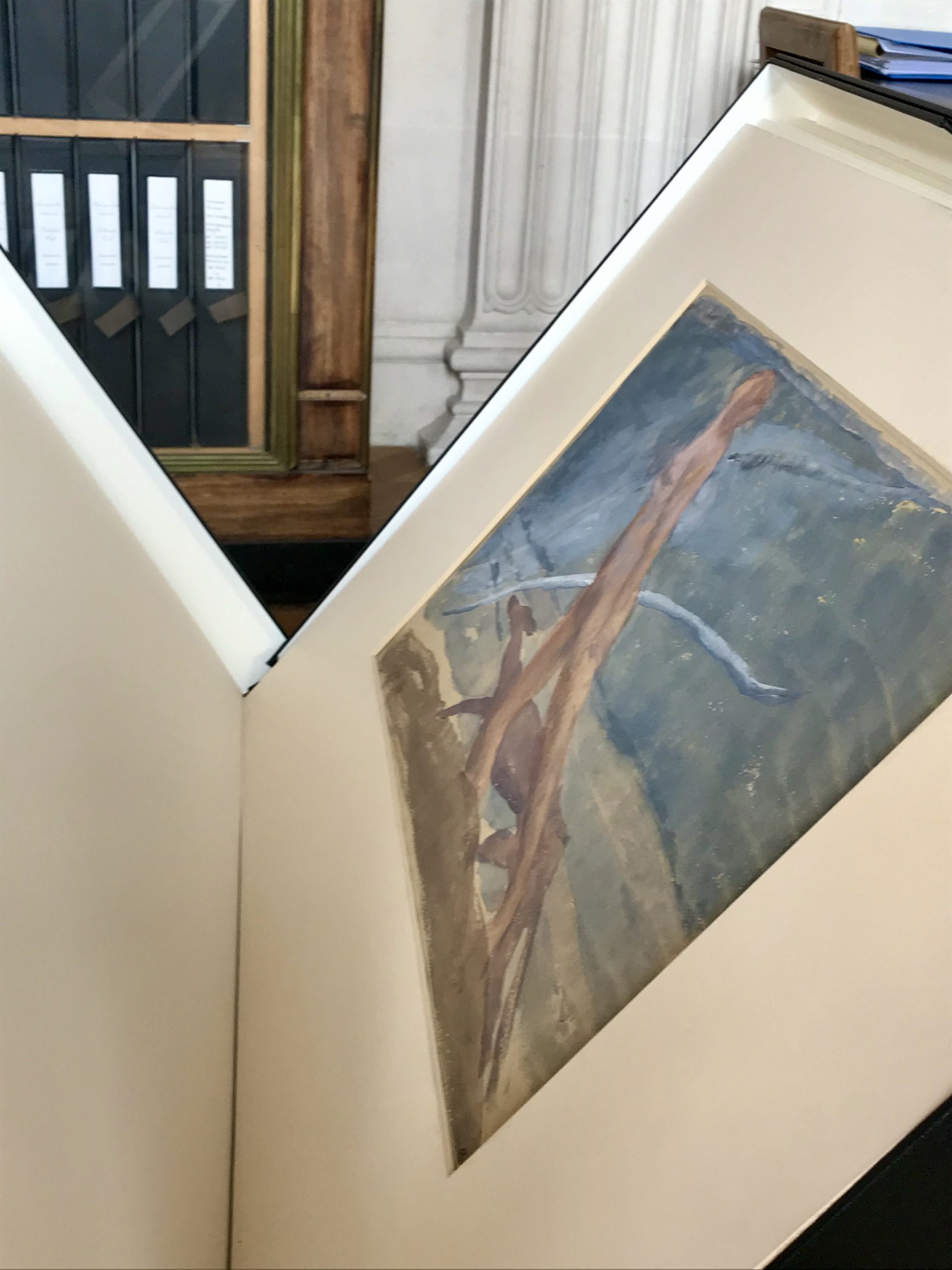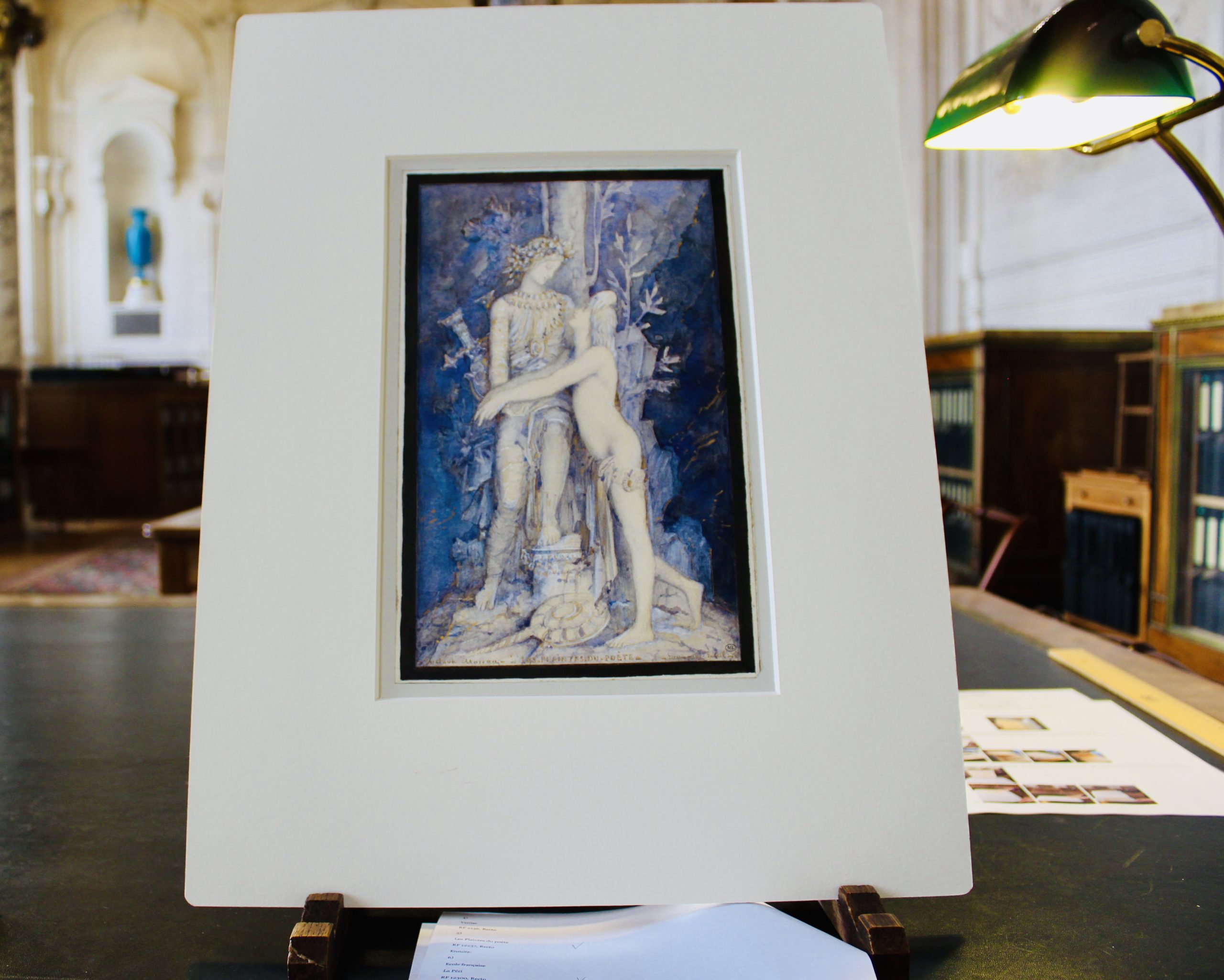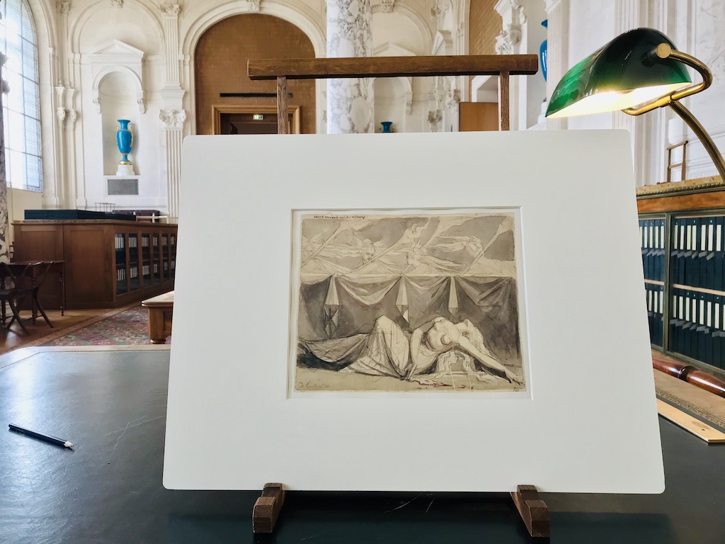 Then you are allowed to select 10 items . You write down the number of the inventory and the name of the artist for each item. Then an employee brings you a big folder where several drawings or paintings (mostly water-colors) of the same artist are stored. You have the one you selected in the folder, but you are also allowed to consult the others, if you want. Very carefully you take them out, one at a time, and then you just gasp at the beauty, and also because it’s so exciting to be physically holding and looking at a drawing or painting by Rubens or Corneille or David or Ingres or Moreau…..