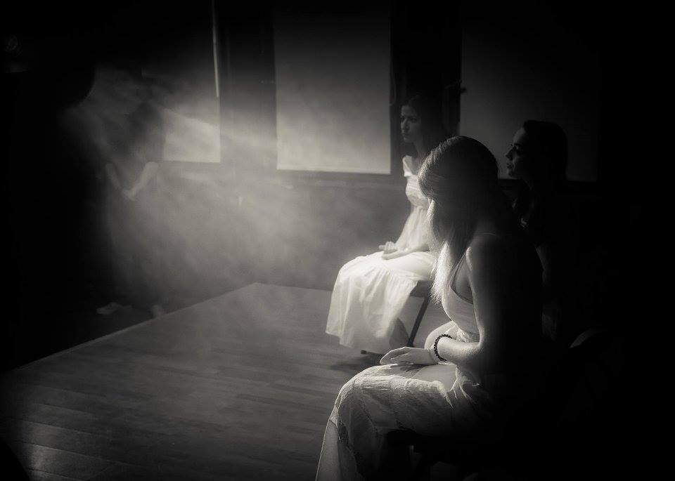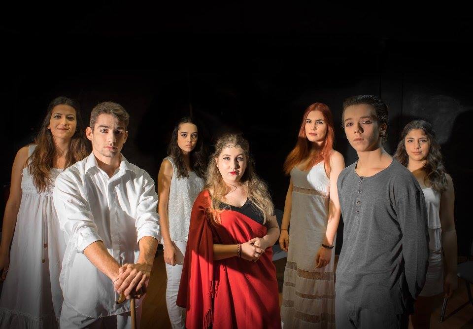 Group picture of the entire team. Creon is standing in the middle surrounded by the Chorus, the guard is standing on her right (as we look at the photo.) From right to left: