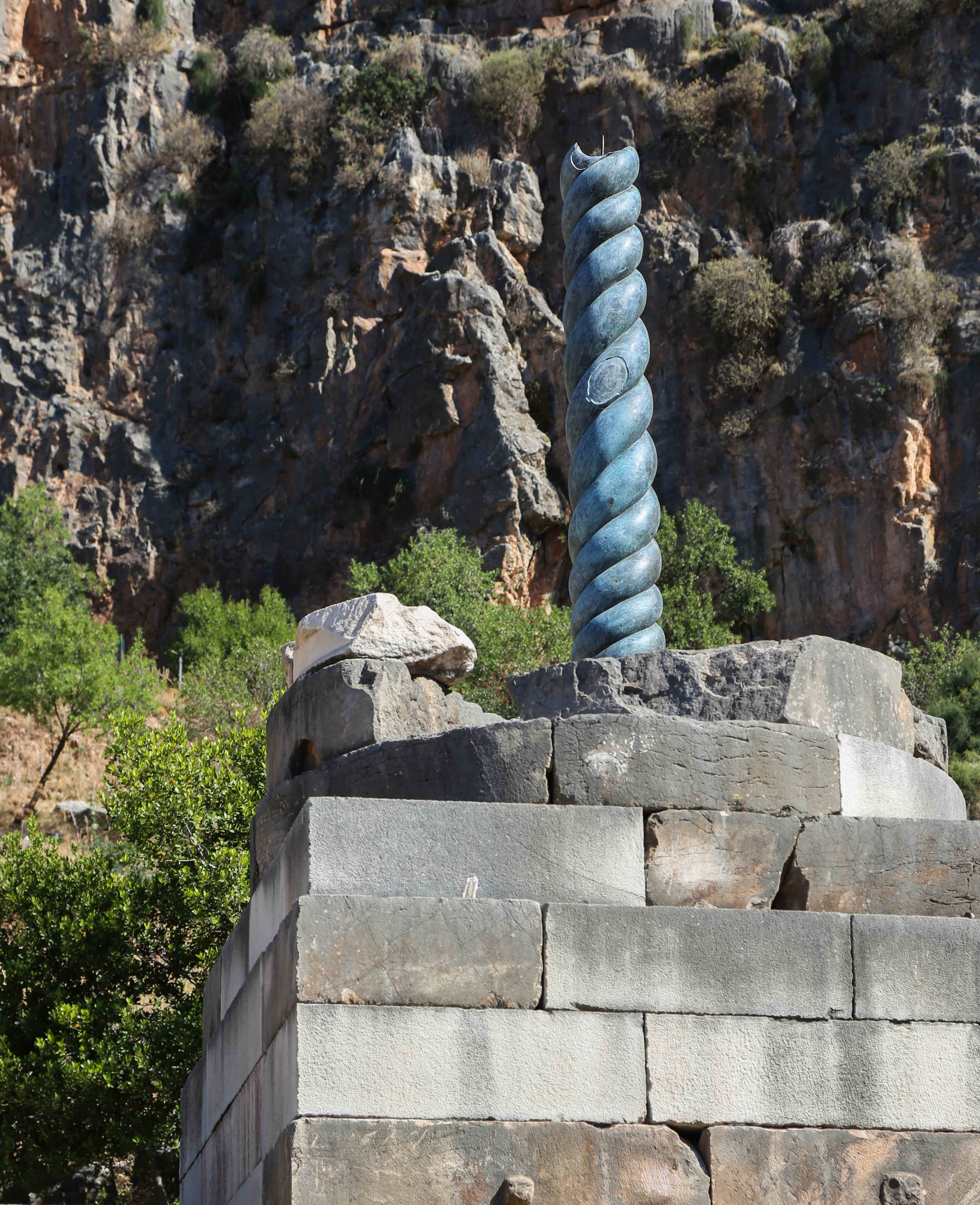 §6[=12].1B. The Serpent Column. A replica now stands where the original monument had been placed, in front of the east entrance to the Temple of Apollo. The centerpiece of the monument was a column around which a bronze serpent is shown coiling all the way to the top, culminating in three bronze serpentine heads that hold up a golden tripod. After the battle of Plataea in 479 BCE, the Greeks celebrated their victory over the invading forces of the Persian Empire by commissioning this Serpent Column and installing it at Delphi at precisely the spot where the replica stands today. The replica shows only the coiling serpent, not the three heads—nor the golden tripod. In 324 CE, the Emperor Constantine I arranged for the original Serpent Column to be removed from Delphi and relocated in Constantinople at the Hippodrome, where it remains to this day. The replica in Delphi, which I mentioned a moment ago, shows what remains of the Serpent Column as it survives in its relocated home at the Hippodrome in Istanbul today. Pausanias saw the original Serpent Column when he visited Delphi, and he has this to say about it: