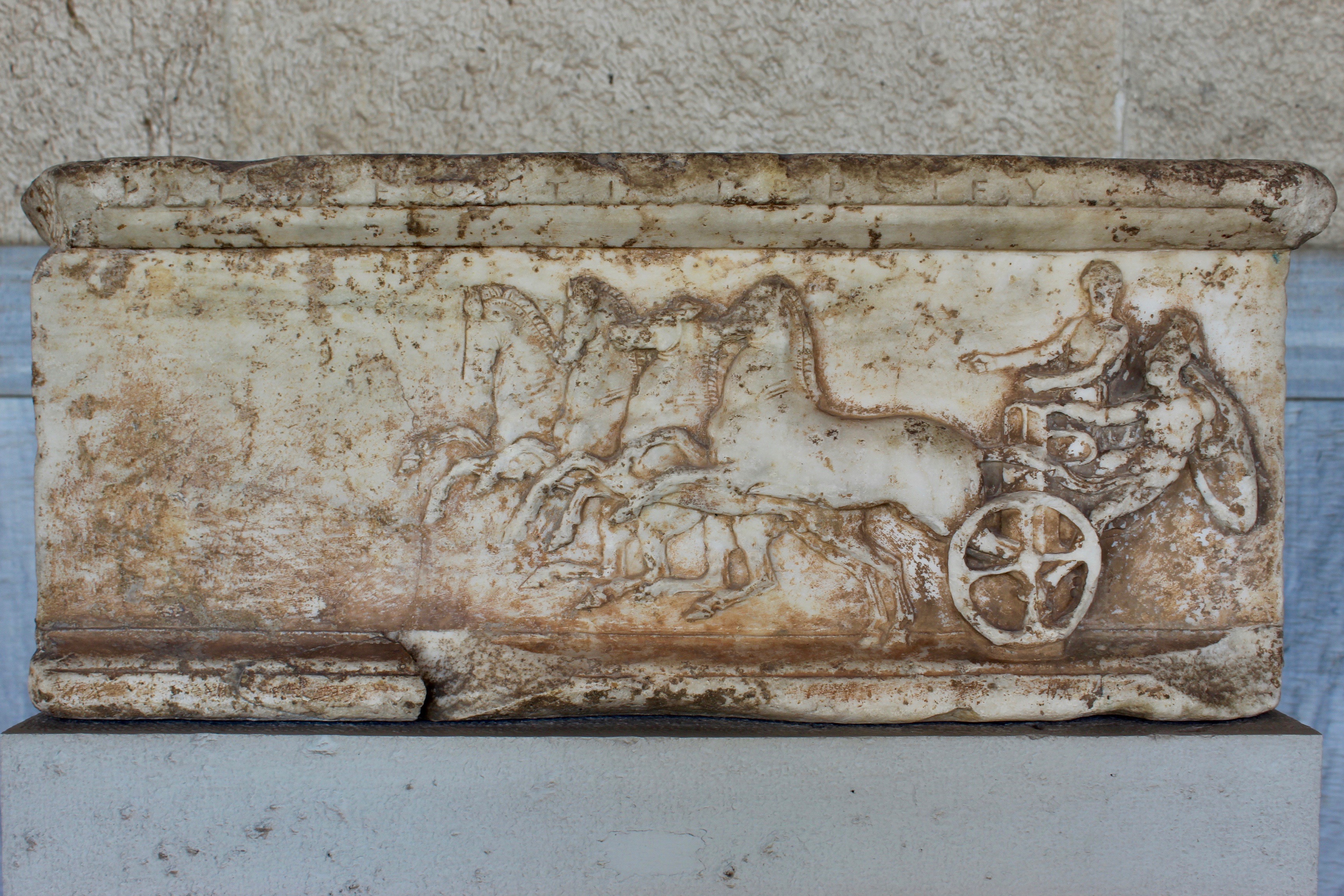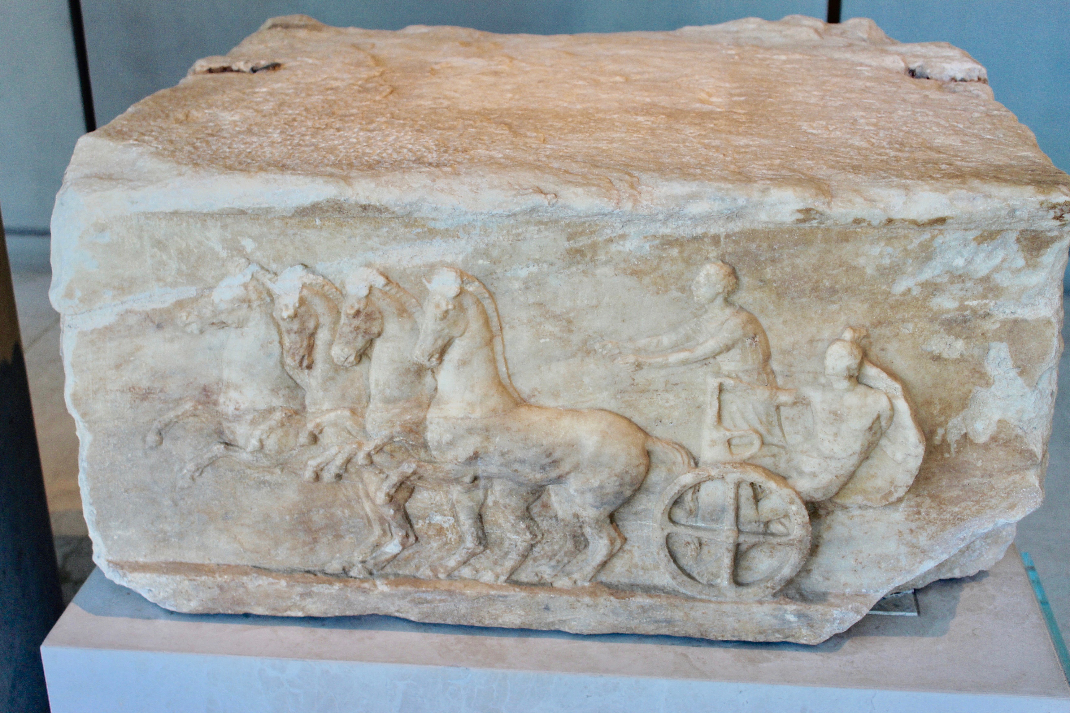 Base of a dedication. The Relief represents a scene from the Apobates Race. Late 4th–early 3rd century BCE, Acropolis Museum, Athens