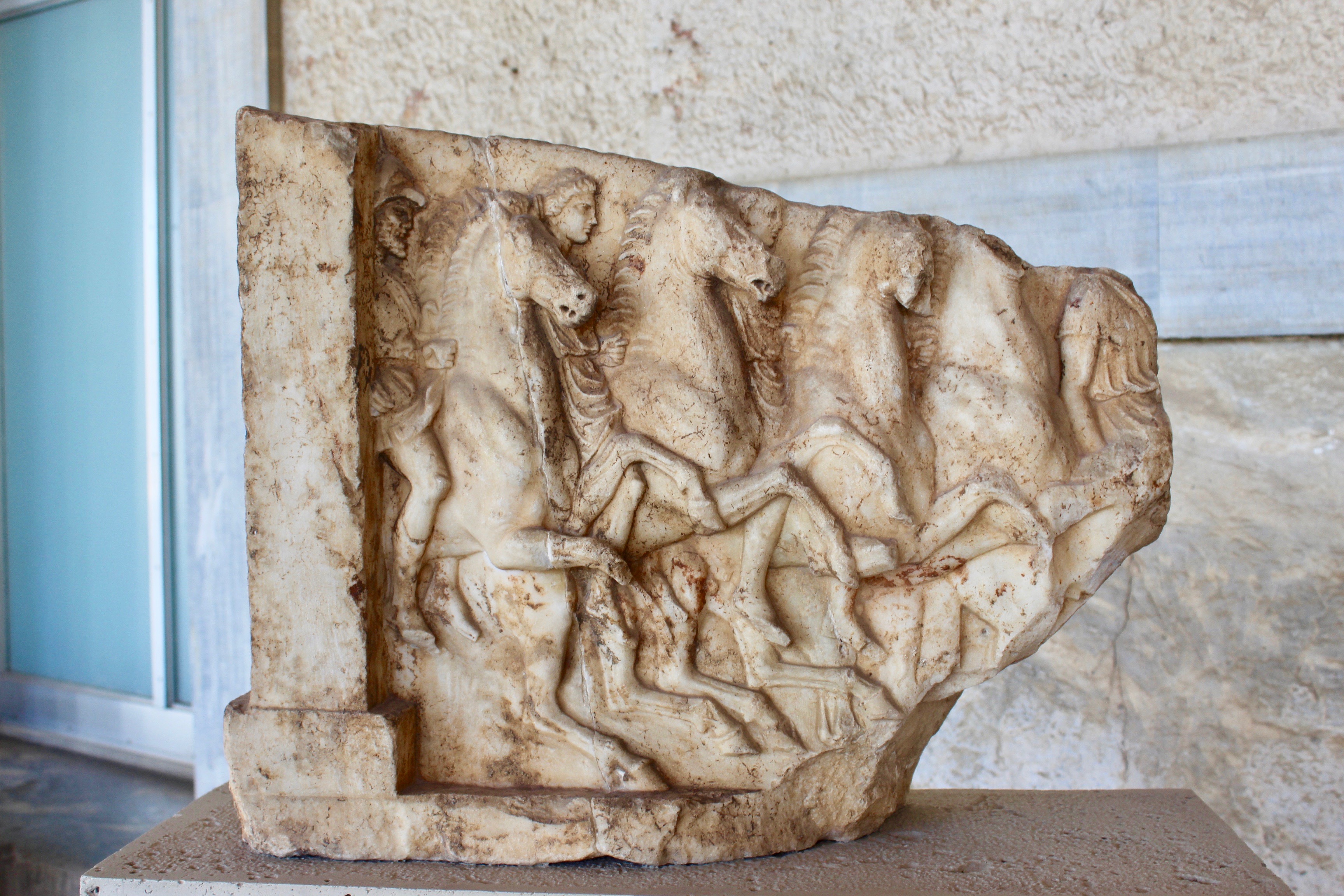 Relief Fragment, Dedication for a victory of the tribe of the tribe Leontis in Anthippasaia, a cavalry contest at the Panathenaic Games, 4th century BCE, Agora Museum