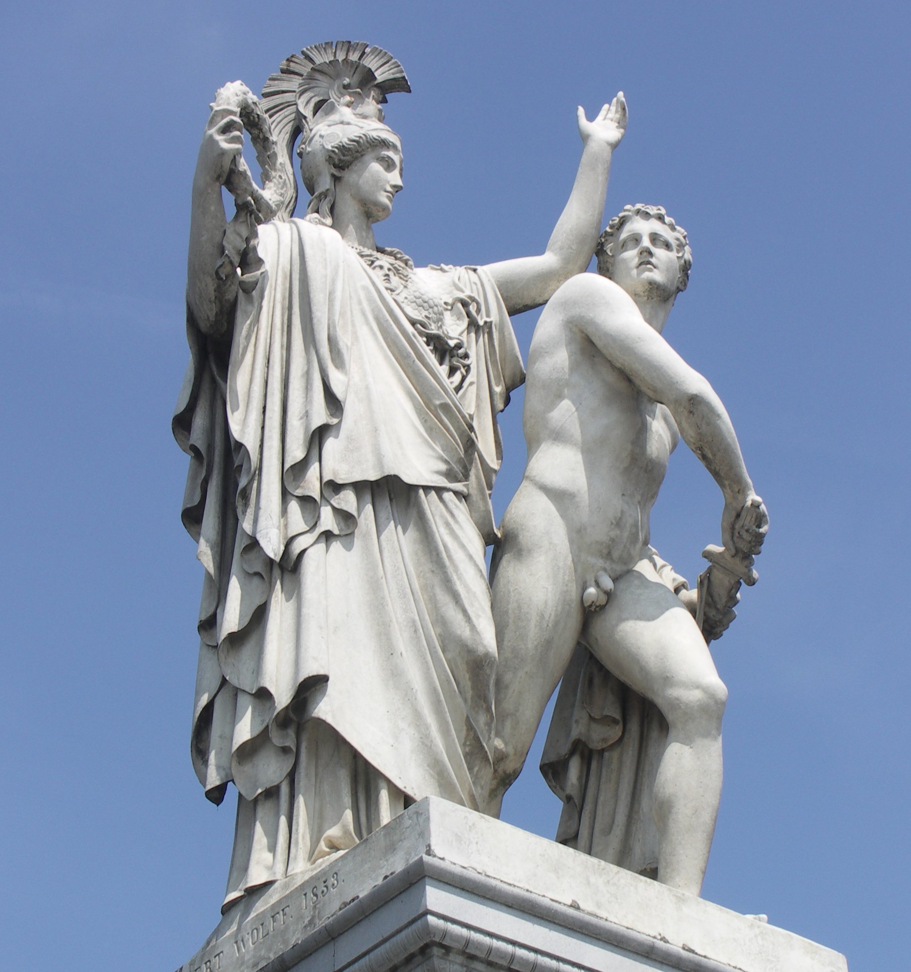 Sculpture of Athena counseling Diomedes shortly before he enters the battle, sculpted by Albert Wolff, 1853. Schlossbrücke in central Berlin.