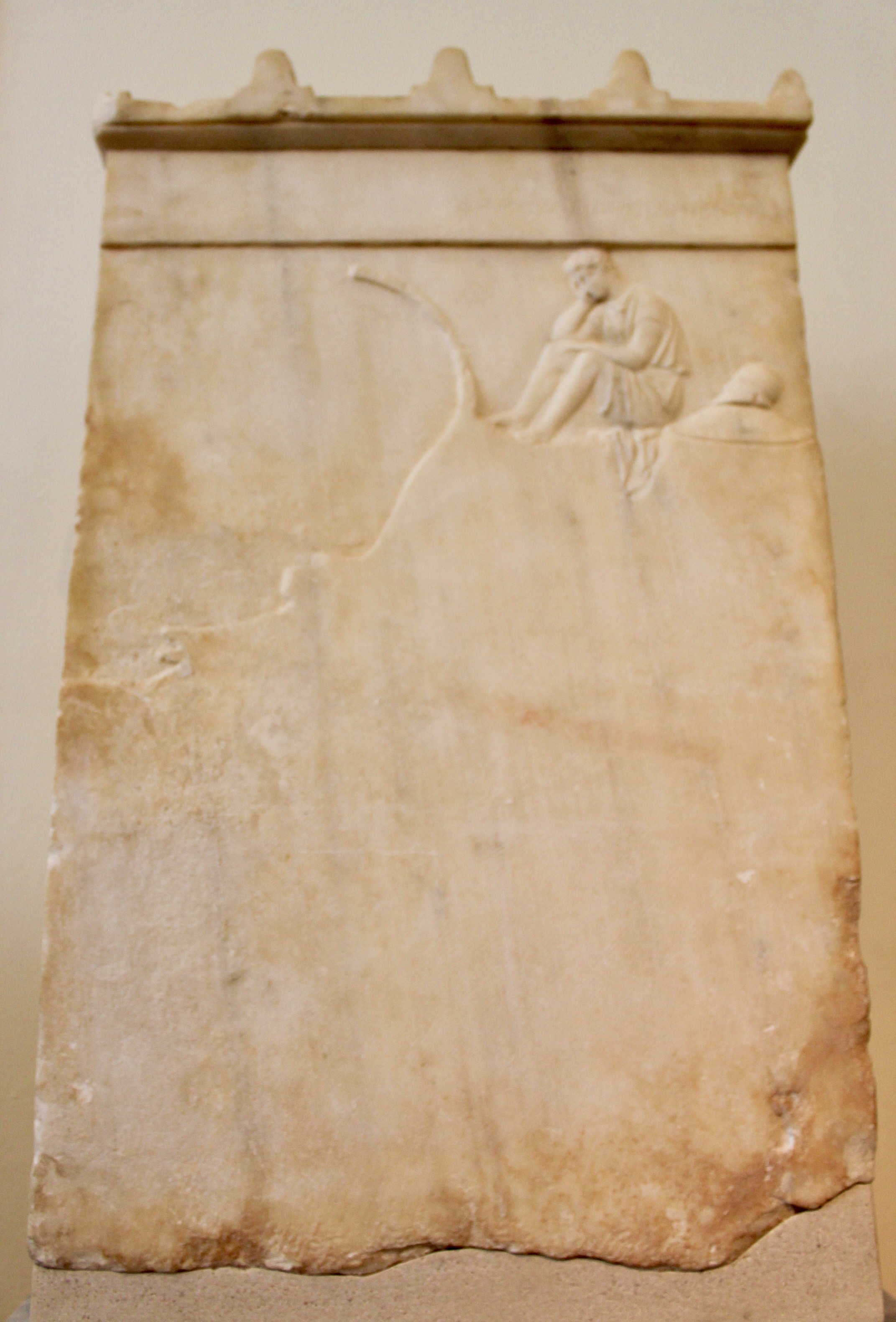 Grave stele, Pentelic marble, found at the Piraeus. Seated on a rock, Demokleides son of Demetrios, a hoplite turns sorrowfully towards the prow of a trireme and the sea, where he lost his life at sea. Early 4th century BCE, National Archaeological Museum, Athens