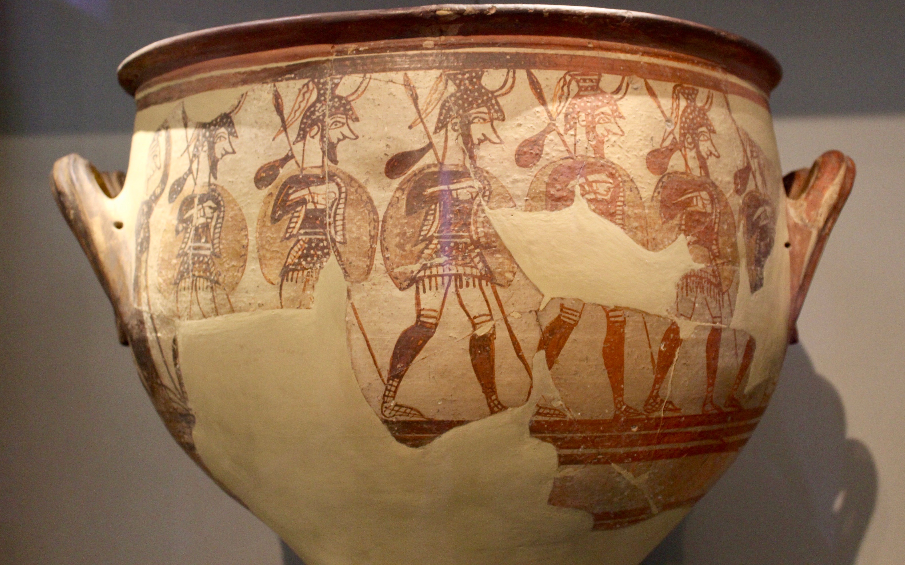 Mycenaean Warriors, Large Kratēr depicting men in full armor, c 12th century BCE, Mycenae Museum