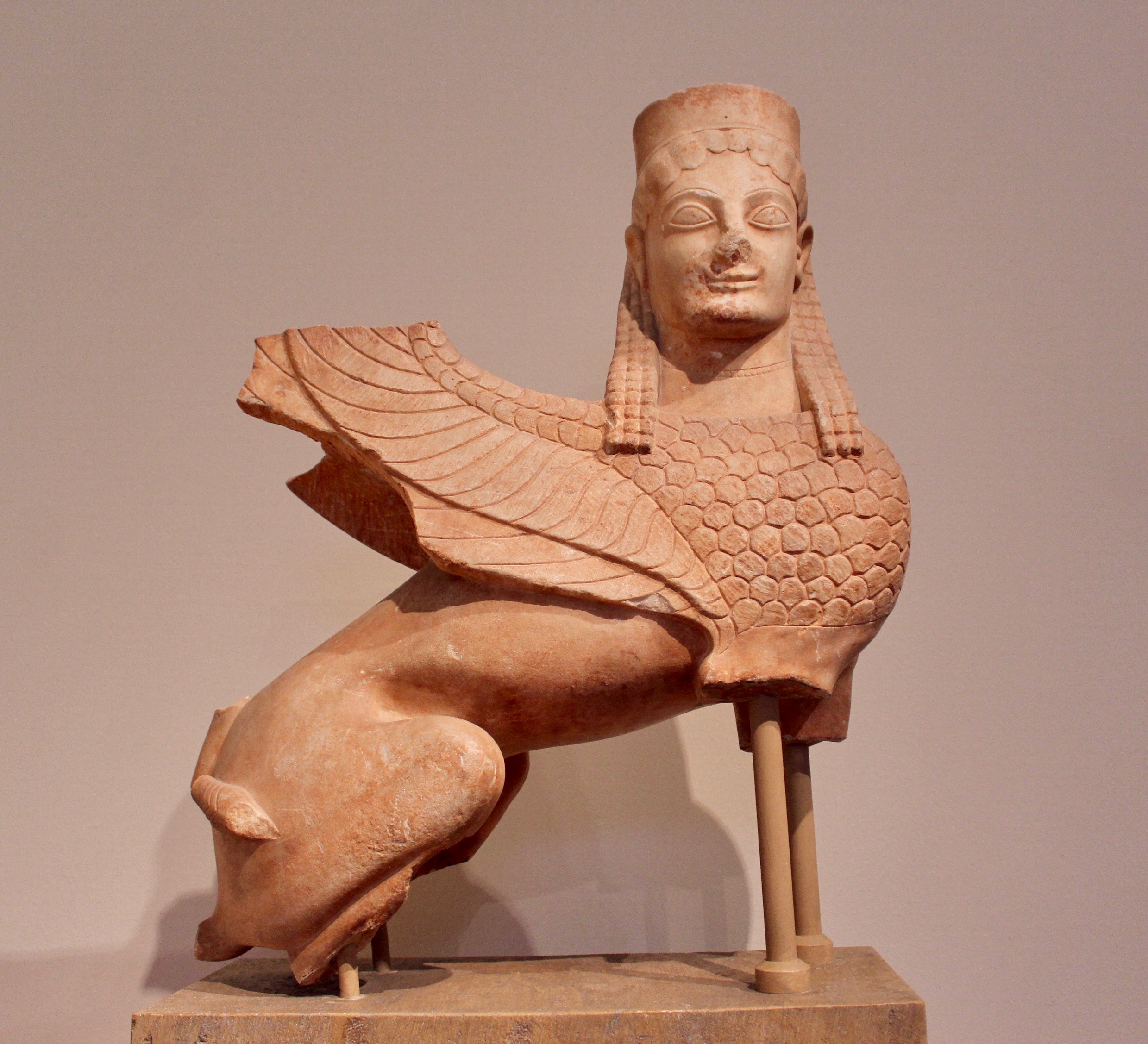 Statue of a Sphinx, Pentelic marble. One of the earliest known Archaic Sphinxes c570 BCE, National Archaeological Museum, Athens